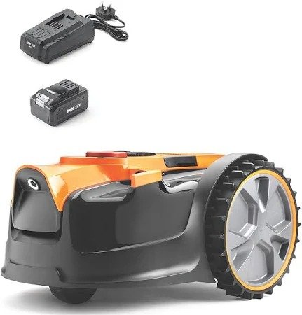 he Lawn Master OcuMow 16 robotic mower combines a high definition camera and sensors with optical grass recognition software to identify grass and navigate around your lawn without the need for a boundary wire outdoor power socket or app. Perfect for lawns of up to 100m2 simply drop and mow. A clearly defined edge around the full perimeter of your lawn such as paving or gravel or a raised edge at least 6cm high is required to prevent the mower leaving the grass. Adjustment of the lawn edges may be required. As with other robot mowers a grass trimmer not included is needed to trim the lawn edges. Not suitable for gardens with overhanging plants undefined flower borders or edges with a drop off. The robot mower will cut in a random pattern for up to 4 hours which covers lawns up to 100m2. The Ocu Mow 16 is designed to mow once or twice a week during daylight hours in dry weather cutting and dropping the grass clippings on the lawn. The 3 pivoting blades can be adjusted to cut grass any height from 20mm to 60mm. High specification deep tread wheels and powerful drive system grips slopes of up to 19 degrees. There are two mowing functions to choose from either a random or spiral cutting pattern. For safety the mower detects and avoids obstacles using the high definition camera and ultrasonic sensors. It also features a safety key preventing use by children and sensors which stop the blades when the machine is lifted. Supplied with a detachable 4.0Ah MX 24V lithium ion battery and fast one hour charger the battery can be charged wherever is convenient with no need for an outdoor power socket. Part of the MX 24V Shared Battery System.
