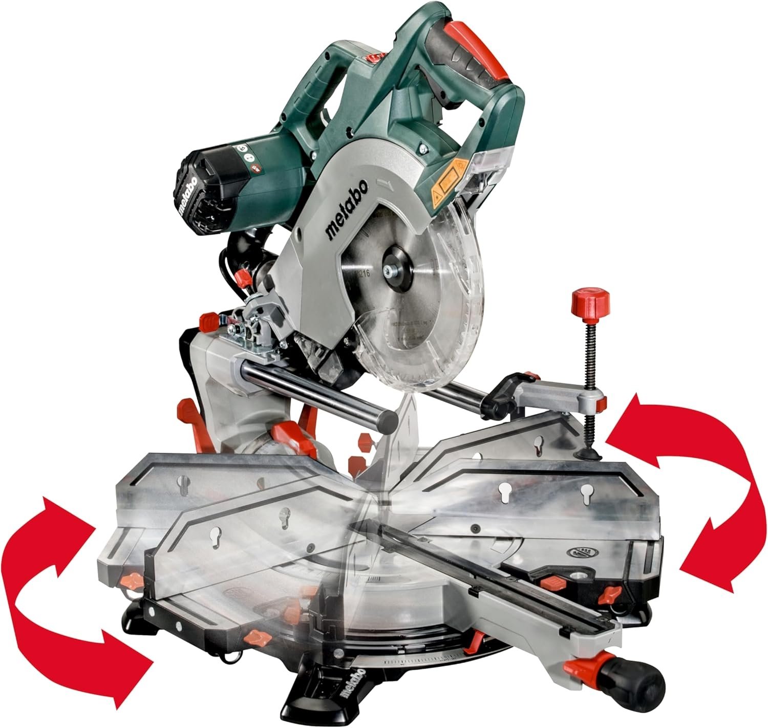 - Massima flessibilitร durante il taglio grazie al piano girevole su entrambi i lati e alla testa inclinabile su entrambi i lati