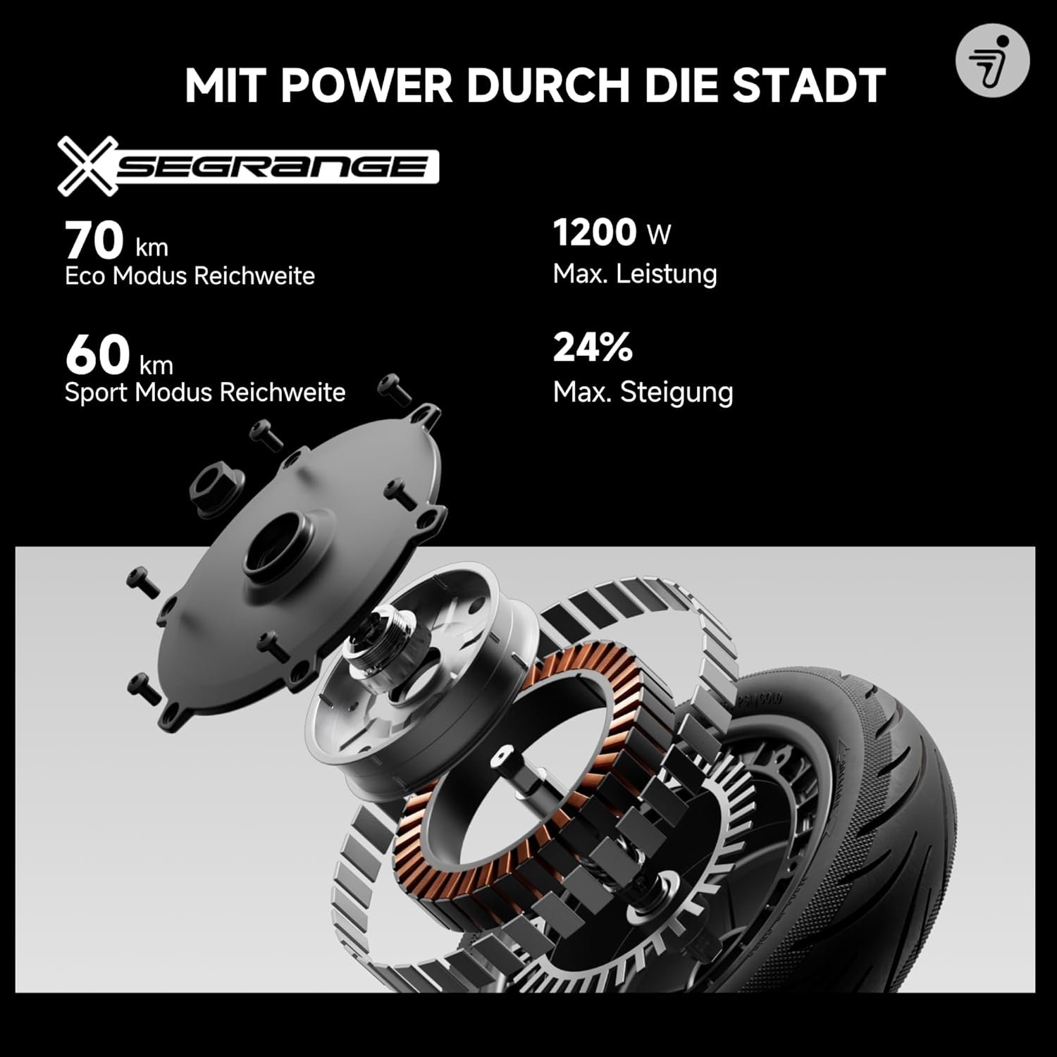 - Raggio d’azione superiore – Fino a 70 km in modalità Eco e 60 km a 20 km/h con una capacità di salita fino al 24%, è perfetto per andare al lavoro quotidiano o per lunghi viaggi in città senza dover ricaricare costantemente.
