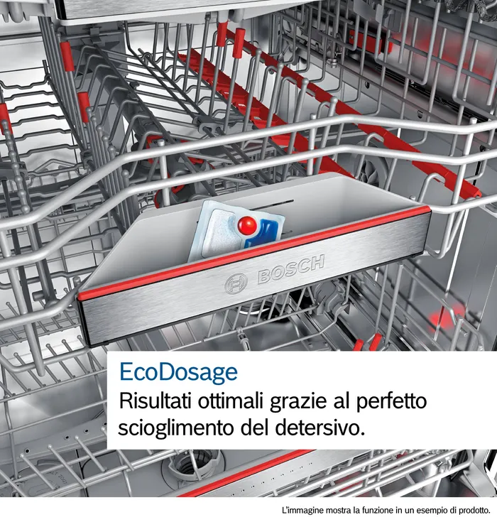 Lavastoviglie Bosch SMS4EMC06E libera installazione classe D con capacità 13 coperti progettata per garantire prestazioni elevate e consumi ridotti, motore EcoSilence Drive silenzioso ed efficiente con lunga durata, livello sonoro 48 dB ideale per uso quotidiano senza disturbo, programma Eco 50°C per ottimizzazione energia e acqua, programma Automatico regolazione intelligente temperatura e consumo in base grado di sporco stoviglie, programma Intensivo 70°C dedicato a pentole e padelle molto sporche, funzione ExtraDry con asciugatura intensificata per stoviglie in plastica, sistema Home Connect con connettività WiFi per gestione da smartphone e tablet tramite applicazione, compatibilità assistenti vocali per controllo comandi con voce, programma Silence per funzionamento ultra silenzioso ideale per ore notturne, opzione SpeedPerfect+ per riduzione tempi lavaggio mantenendo ottima qualità pulizia, partenza programmata fino a 24 ore per massima flessibilità, cestello superiore regolabile in altezza con sistema Rackmatic per adattamento rapido a diverse dimensioni stoviglie, cestelli progettati con inserti abbattibili per gestione flessibile spazi, display LED chiaro con informazioni su programma selezionato, tempo residuo e impostazioni, indicatore sale e brillantante per manutenzione semplice, tecnologia AquaStop con protezione totale contro perdite d’acqua garantita per tutta vita apparecchio, efficienza energetica classe D con consumi ottimizzati per lavaggi quotidiani, design moderno con pannello frontale bianco e dettagli eleganti adatto a ogni cucina, dimensioni standard 60 cm per installazione libera e versatile, costruzione robusta e affidabile secondo qualità tedesca Bosch, supporto continuo tramite applicazione Home Connect con consigli, aggiornamenti e notifiche intelligenti, elettrodomestico ideale per famiglie che cercano combinazione tra efficienza, silenziosità e innovazione tecnologica.