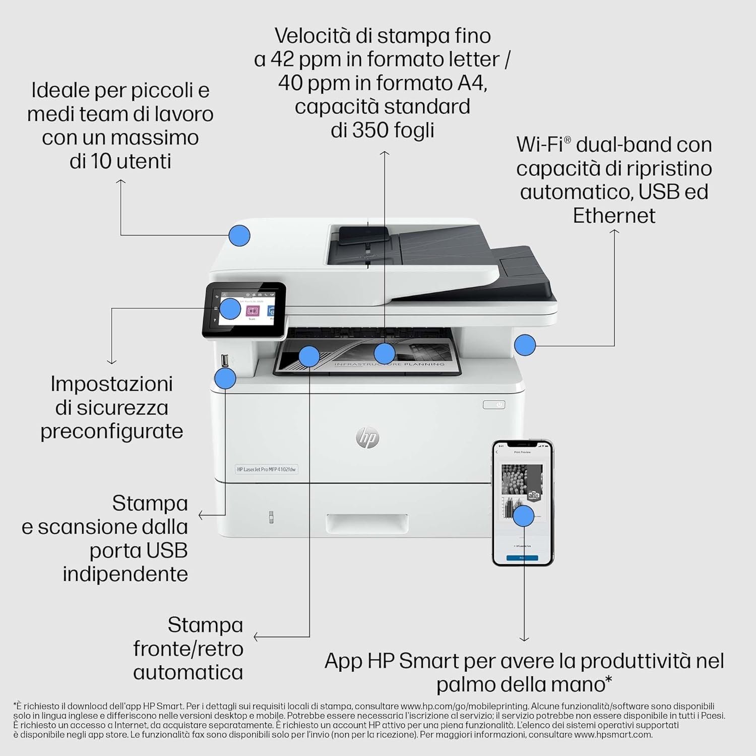 - Stampa: fino a 42 ppm, vassoio multifunzione da 100 fogli, alimentatore da 250 fogli, raccolta da 150 fogli, ADF da 50 fogli; linguaggi di stampa supportati: HP PCL 6, HP PCL 5e, PDF, URF, PWG Raster