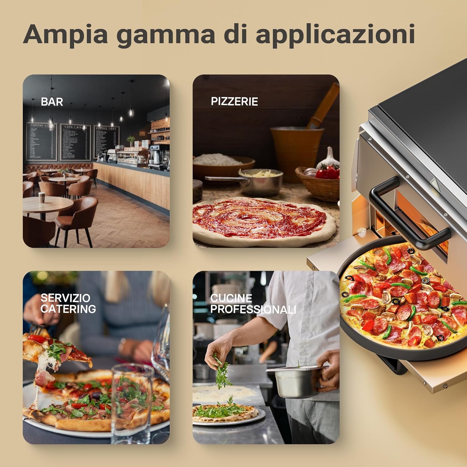 - [Fuzionalità ottimale] – Dotato di due camere di cottura, tre termostati e un timer, il fornetto permette di cucinare due pizze contemporaneamente con diverse impostazioni di cottura. Ideale per le serate in compagnia