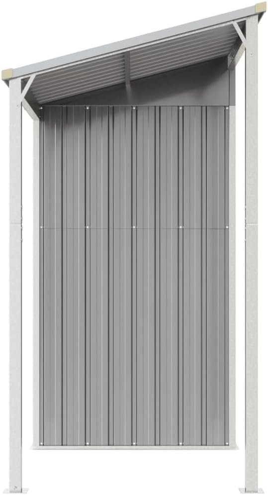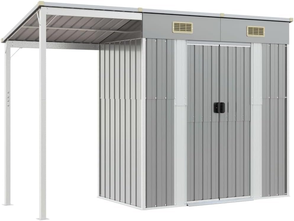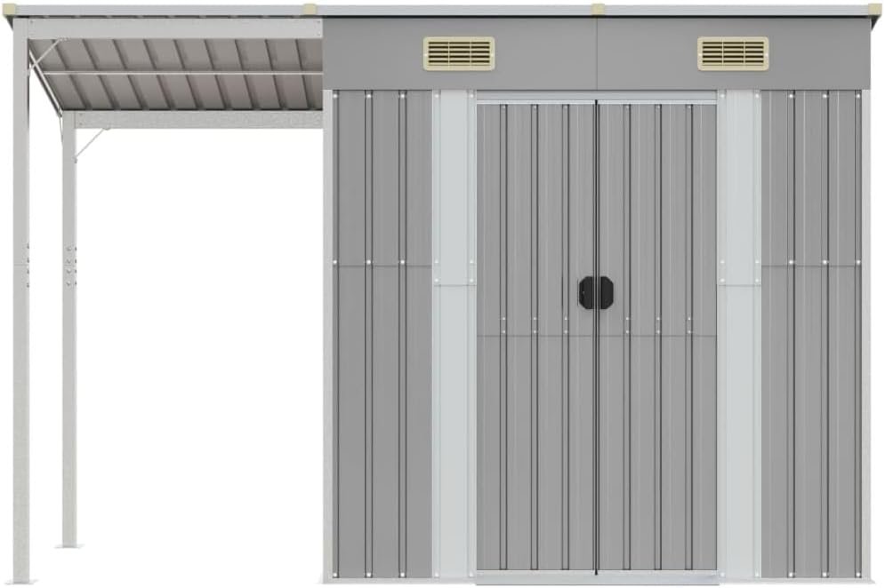 Mobili per la casa e il giardino Capanno da giardino con tetto esteso grigio chiaro 277 x 110,5 x 181 cm in acciaio: questo robusto capanno da giardino, che si distingue con un tetto allungato, รจ perfetto per riporre un’ampia varietร  di oggetti come attrezzi, mobili da giardino, attrezzature da giardino e altro ancora. Materiale robusto: la casetta per attrezzi da giardino รจ realizzata in acciaio zincato, che previene la ruggine e resiste a lungo termine. L’acciaio รจ un materiale eccezionalmente duro e resistente. Offre robustezza e stabilitร . La zincatura fornisce una migliore protezione contro la corrosione ed รจ utile per prodotti che verranno utilizzati all’aperto e in ambienti difficili. Ampio spazio di archiviazione: questo capanno in metallo offre molto spazio per riporre legna da ardere, attrezzi da giardino, mobili, attrezzature e altro ancora. Ha anche un tetto allungato per riporre la legna da ardere. Il tetto puรฒ essere fissato su entrambi i lati del capannone. Pratiche maniglie: il capanno รจ dotato di maniglie sulla porta per un facile ingresso. Buona ventilazione: il capanno esterno รจ dotato di 2 prese d’aria, che forniscono ventilazione per ridurre l’accumulo di umiditร  e odori in casa. Design inclinato: il tetto inclinato garantisce un drenaggio dell’acqua senza impedimenti.