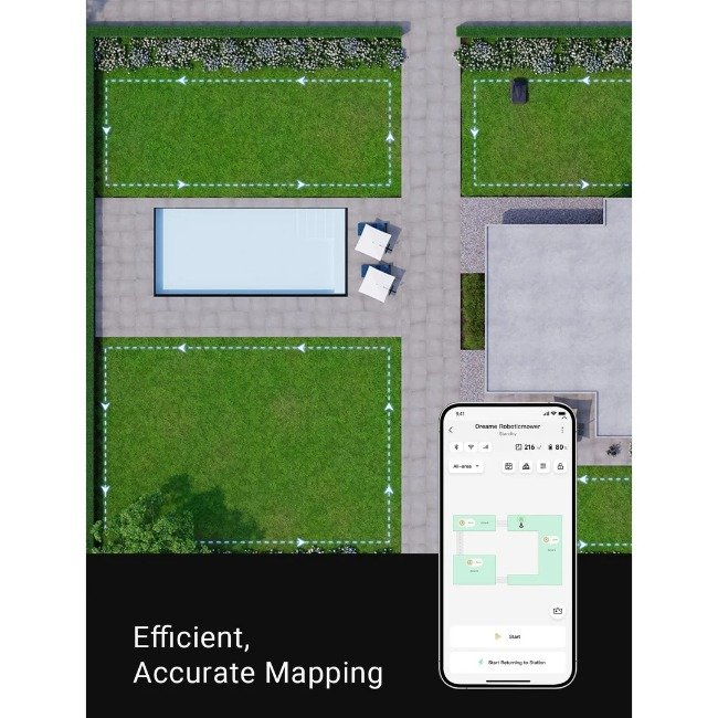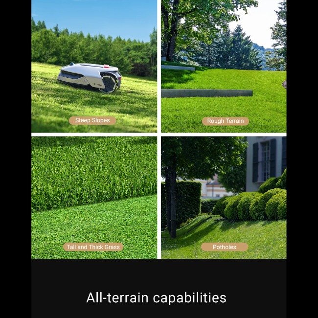 Efficient, Accurate Mapping – Featuring a 3D high-precision LiDAR sensor, A1 has a detection distance of up to 70m and a 360° × 59° wide angle. These parameters allow the mower to perceive and quickly map your yard in all directions with a precision down to 1cm.
