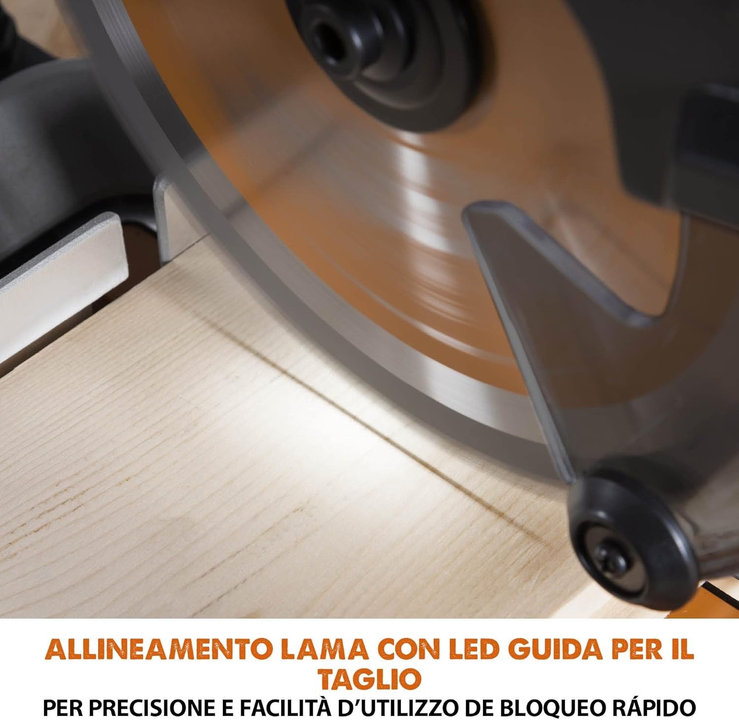 - Longitudinal cuts can be easily performed thanks to the LED work light that projects a precise cutting line on the workpiece surface