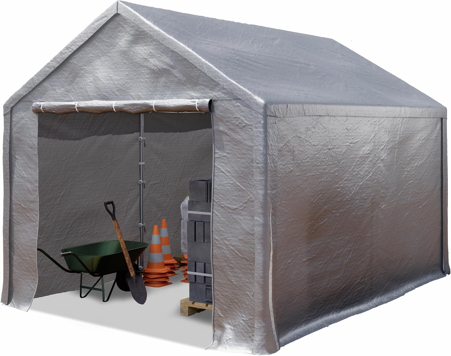 • Facile da montare: tenda a tettoia con pali in acciaio con sistema a scatto, telone, teli laterali continui, teli frontali con ingressi, anelli in gomma, picchetti da terra, corde di tensionamento, istruzioni di montaggio.